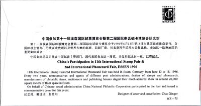 China PRC Event Cover ESSEN 96 Intl Stamp Phonecard Show WZ-75 ZAYIX 052922SM30