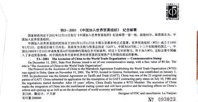 ZAYIX China PRC First Day Cover FDC World Trade Organization 0924M0660