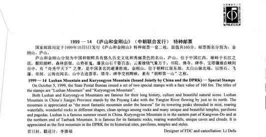 China PRC FDC Lushan & Kuryongyon Mountain Joint IssueSTAMPS ZAYIX 0924M0716