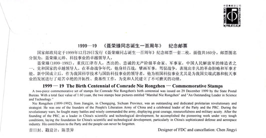 China PRC First Day Cover FDC Comrade Nie Rongzhen birth ZAYIX 0924M0584