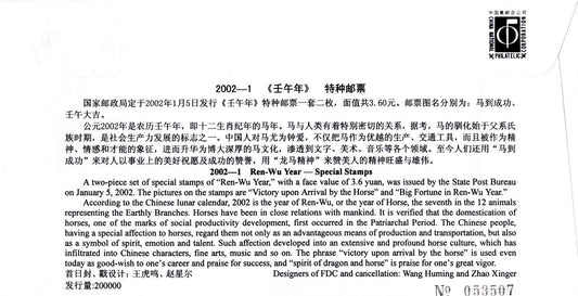 China PRC First Day Cover FDC Lunar New Year Horse Snake 2002 ZAYIX 0924L0510