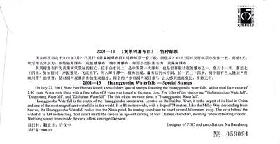 China PRC First Day Cover FDC Huangguoshu Waterfalls 2001--13 ZAYIX 0924L0503