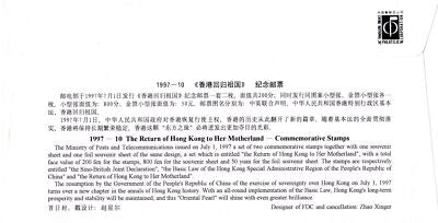 China PRC First Day Cover FDC Hong Kong's Return ZAYIX 0924L0523