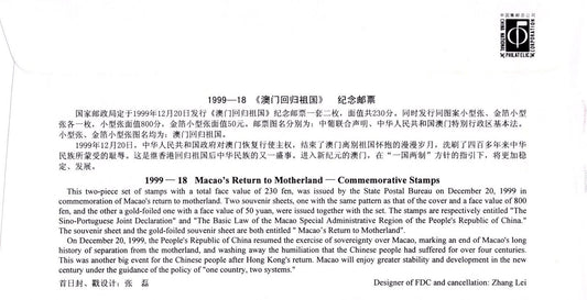 China PRC First Day Cover FDC Macao's Return to Motherland ZAYIX 0924L0500