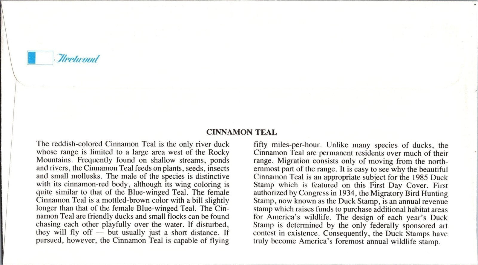 1985 US RW52 Fleetwood FDC Federal Hunting Permit Duck Stamp ZAYIX 113022SM83