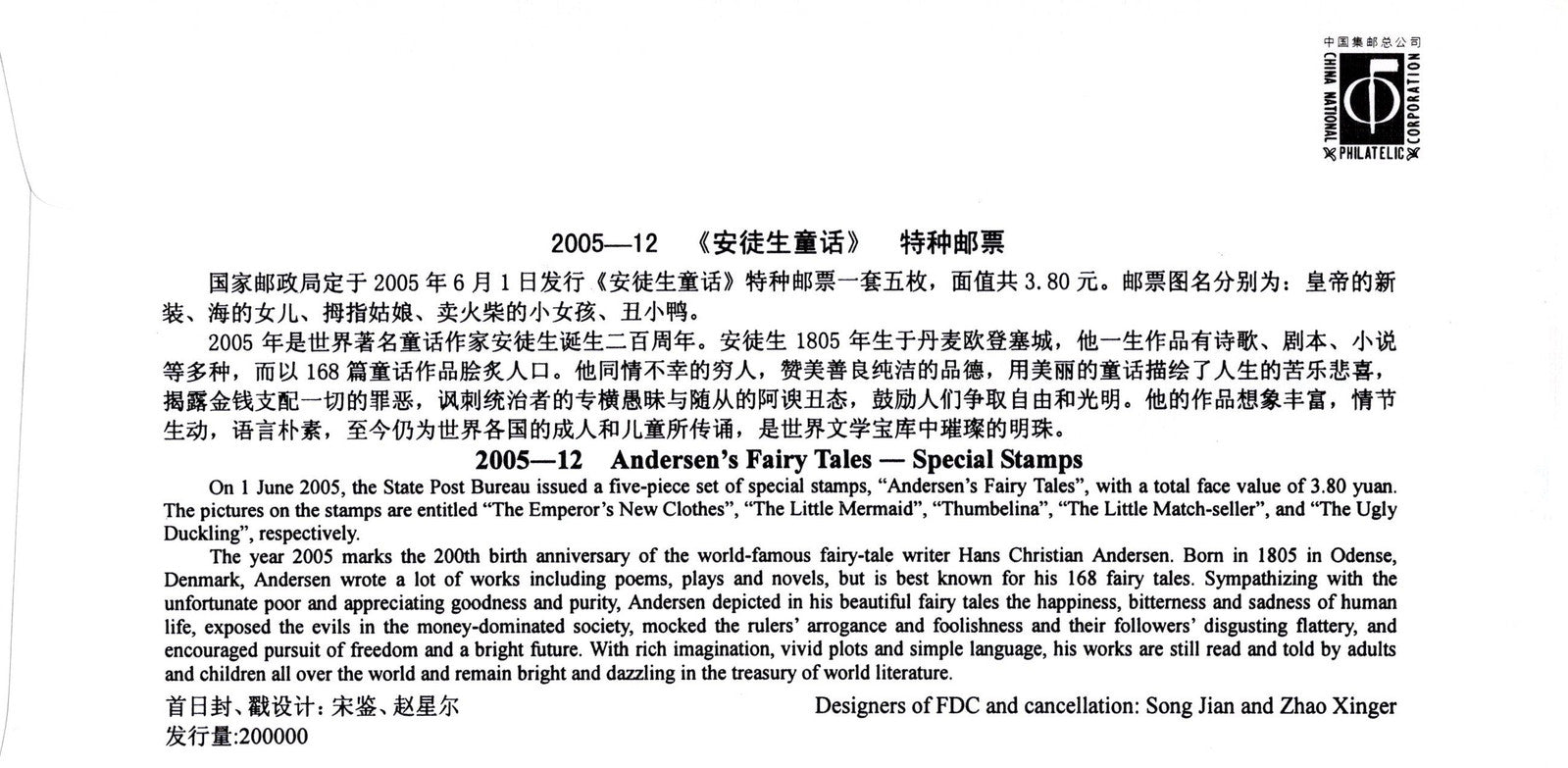 China PRC First Day Cover Andersen's Fairy Tales, ducksSTAMPS ZAYIX 0924M0559