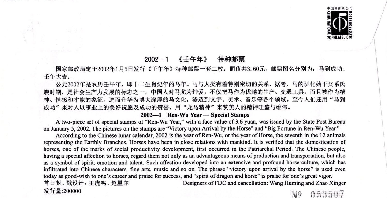 China PRC First Day Cover FDC Ren -Wu Year of the Horse ZAYIX 0924M0574