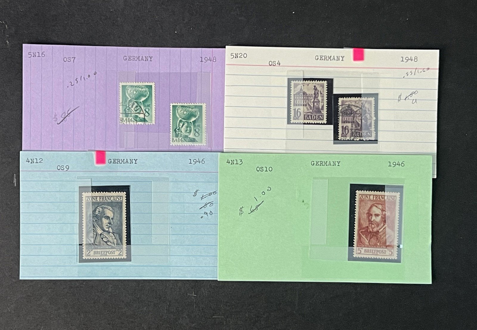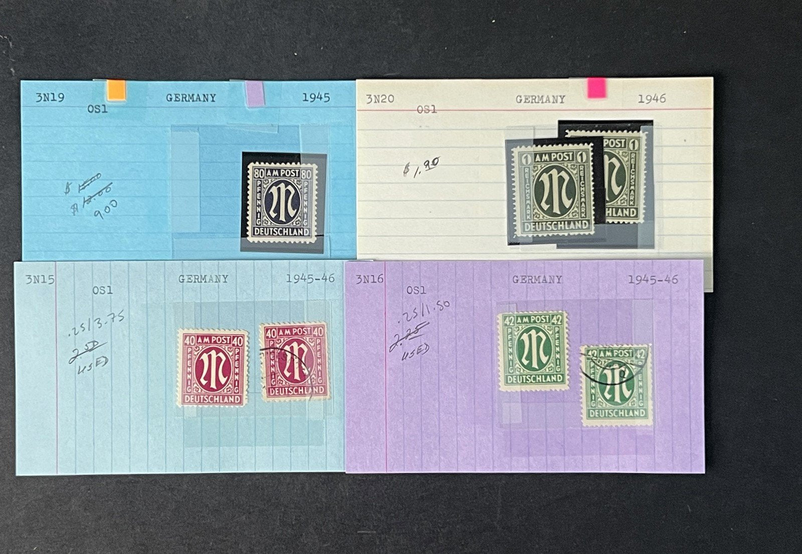 This is a collection of 100s of stamps identified by Scott number on 104 size Dealer cards with a 2025 Catalog Value of more than $740. It includes allied occupation and Berlin zone stamps. The collection includes duplicates but in most cases in small numbers. The cards are stored in a 12.5" box that is full (hundreds of cards). In general condition is FVF or better, but there may be some faults or lower grade stamps mixed in. The photographs are a sample of what is included. Not all cards were photographed. The entire box can be yours for mere pennies per card.