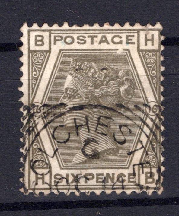 Great Britain 62, Plate 16, 6p Gray Victoria with VF centering and a tiny tear at the top right. It bears a neat Colchester (Essex) CDS and has a nice appearance despite its flaw.