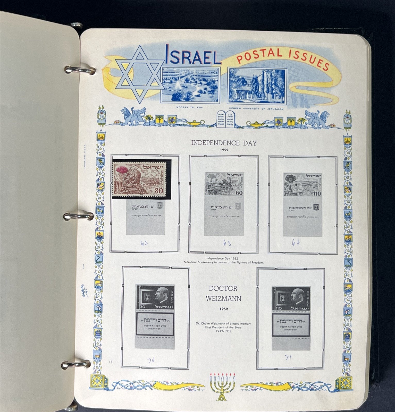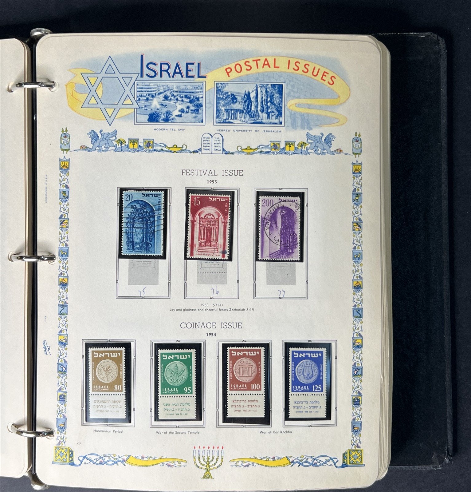 This is a collection of 608 mint and used stamps Includes singles, sets, tabs, souvenir sheets and is presented in a White Ace 3-ring album with pages from 1948-1975. There is plenty of room to expand. The album is in fair condition. In general, stamps are FVF or better with a few faults possible. Make sure to view our other Israel collections.