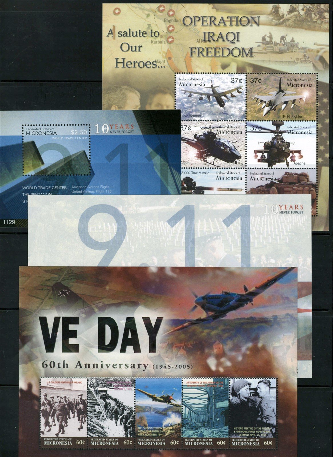 The tiny island nation of Micronesia has remembered some of the world's great battles and wars on the stamps in this collection. You will find everything from World War II battles such as D-Day, Operation Iraqi Freedom and the 911 Attack on this FOUR stock page collection of Mint Never Hinged (MNH) miniature sheets and souvenir sheets. Whether you are a collector of stamps or just a student of military history, this collection is for you.Note, one of the sheets has a crease that is visible upon close inspection. It was not counted in the price.