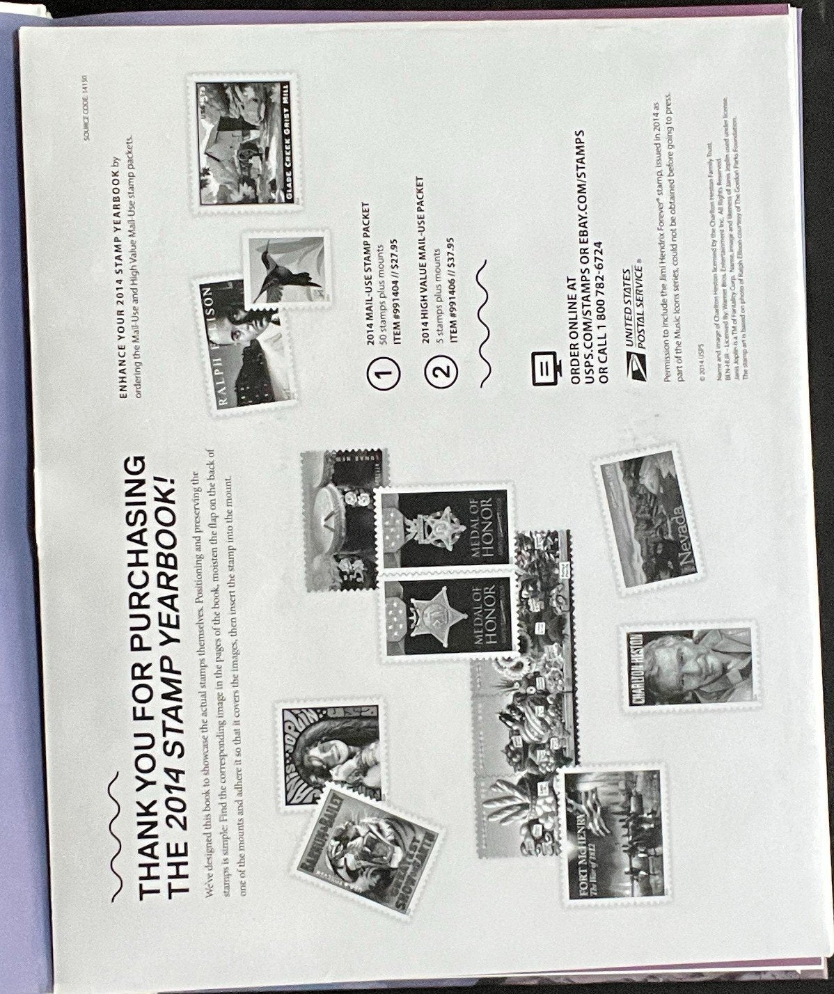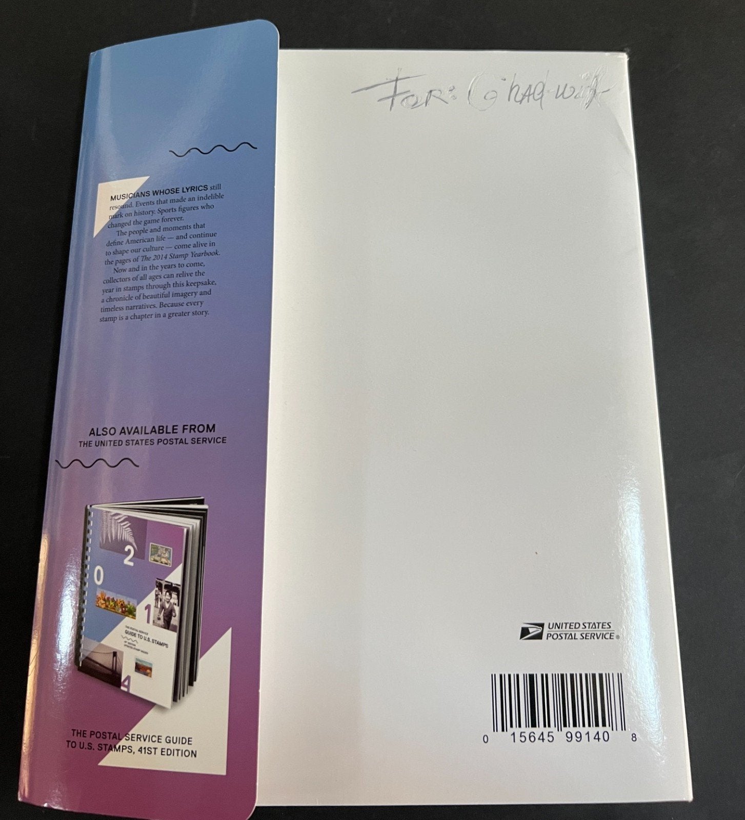 United States 2014 Commemorative Stamp Yearbook published by the USPS. Includes 4905v, this souvenir sheet with serpentine die cuts was only available in the 20014 yearbook. Back of the slip cover case has pen writing visible as seen in photos. This beautiful book details every stamp issued by the U.S. Postal Service in 2014. Read the stories of the people, places, and occasions that have inspired us as a country, preserve each of the commemorative stamps directly in the book for years to come. General condition is fine to very fine (F/VF) or better, but there may be a few faults mixed in. Full photos of collection will be listed below.