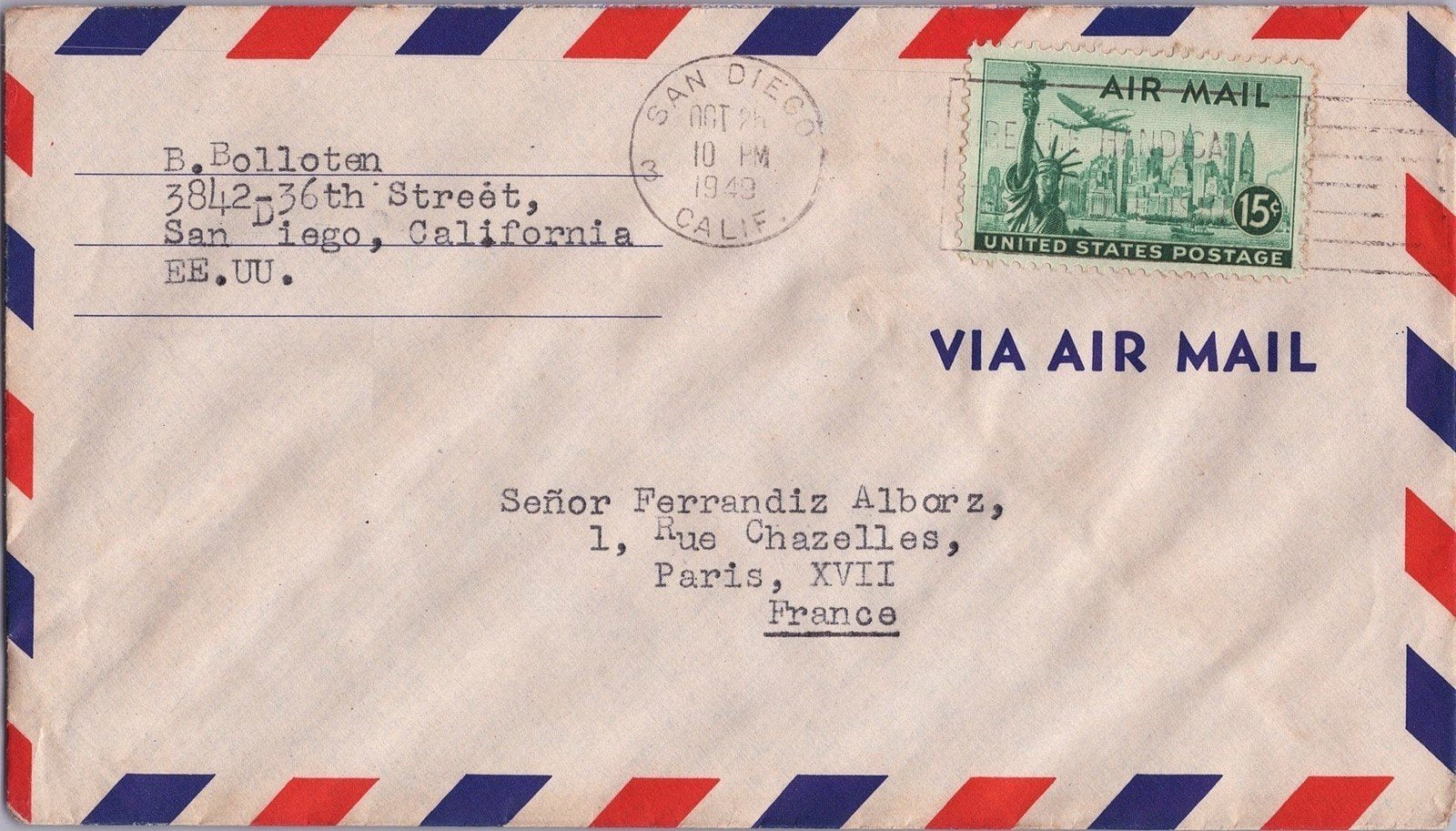 United States Air Mail 15c Plane over Liberty San Diego to France