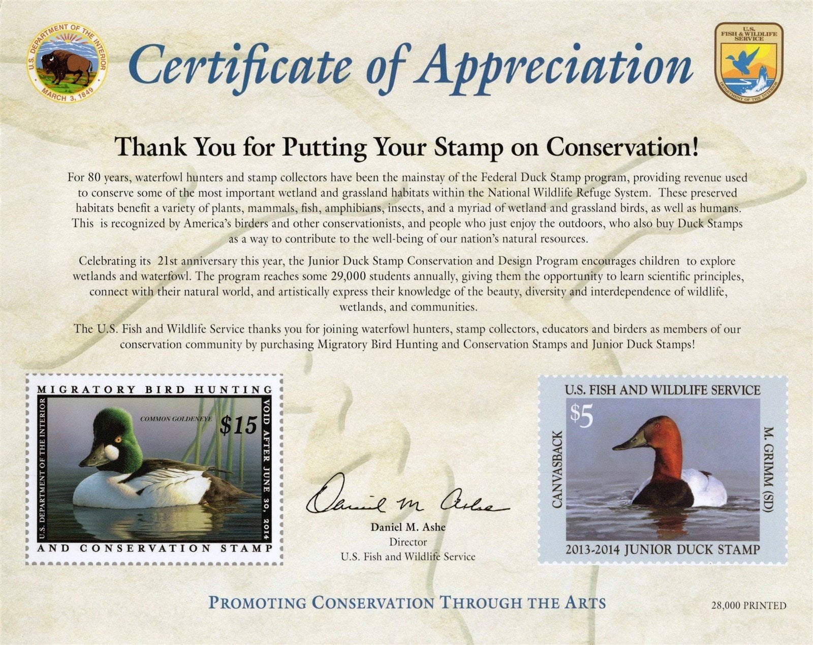 US Duck Stamp 2013 Certificate of Appreciation Card RW80 JDS21 ZAYIX 0625L0062M