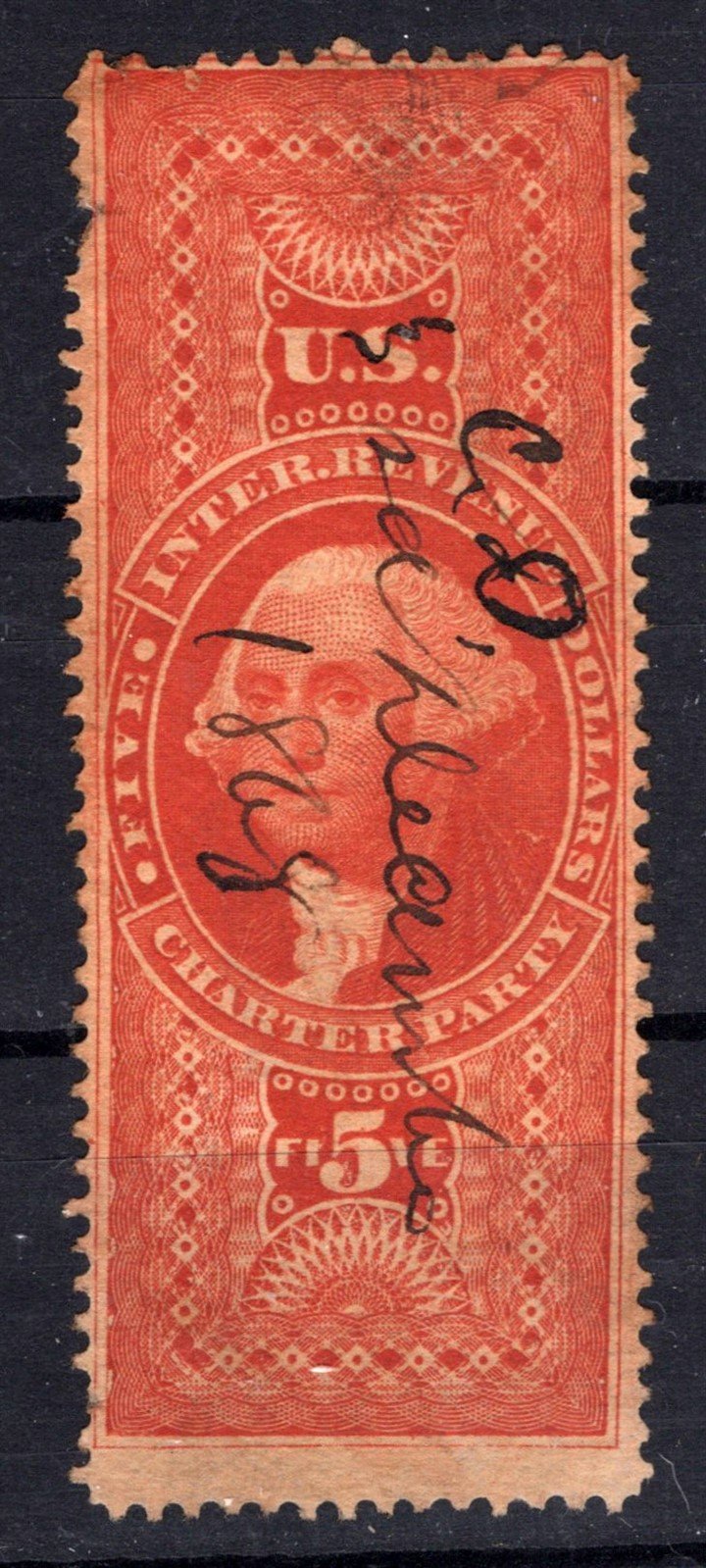 US R88d Used F $5 red Charter Party, silk paper, minor faults Revenue. 2025 Scott Catalog Value $170.