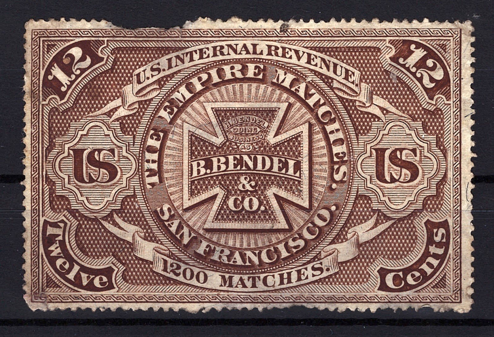 Private Die Proprietary Stamps, which most collectors refer to as Match and Medicine stamps, were most often torn or otherwise damaged when the box or container the stamp was afixed to was opened. Scott Catalog prices the stamps assuming they are somewhat faulty and in Fine-Very Fine (F/VF) condition. Faults such as small tears, pinholes, thins, etc. are common, but should not be readily apparent on the face of the stamp. Ordinary stamps usually sell for full catalog price or better. Stamps that are sound (fault free) and/or that are nicely centered (grade better than FVF) frequently sell for several times the stated catalog price.