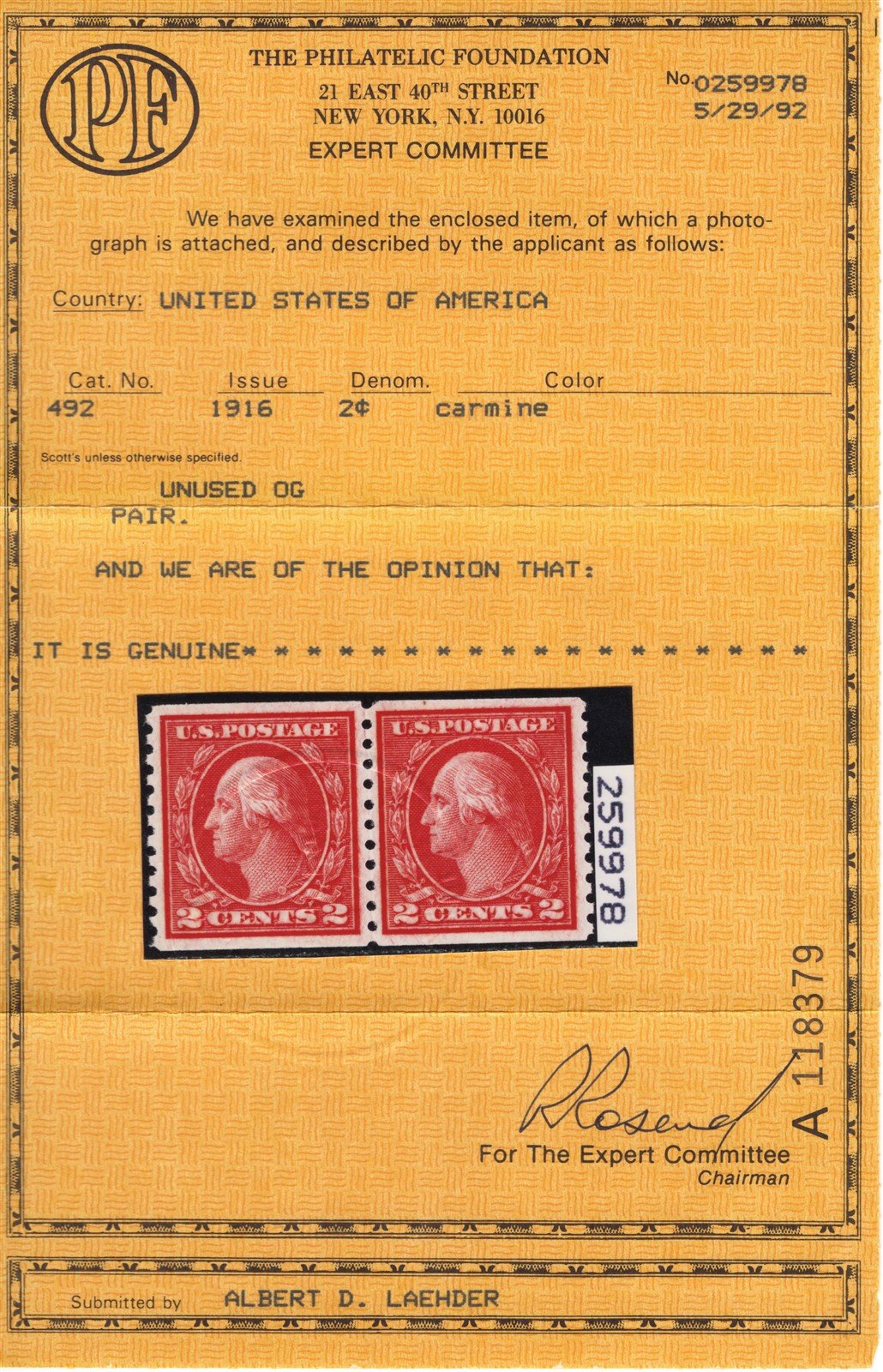 US Stamp 492 MNH XF/S 2c Washington coil pair with PF Cert ZAYIX 1024M_MAR023