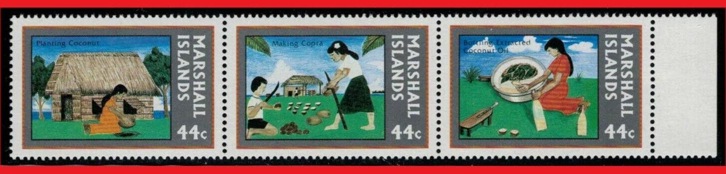 1987 Marshall Islands 159a MNH art, children's drawings, Copra Industry triptych, horizontal strip of three stamps, Zayix 082422SM07