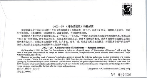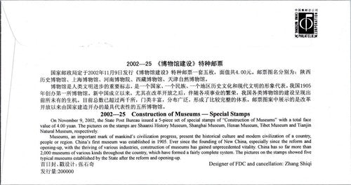 2002 China PRC Mi 3405-3409 FDC Museum Construction ZAYIX 101822SM02