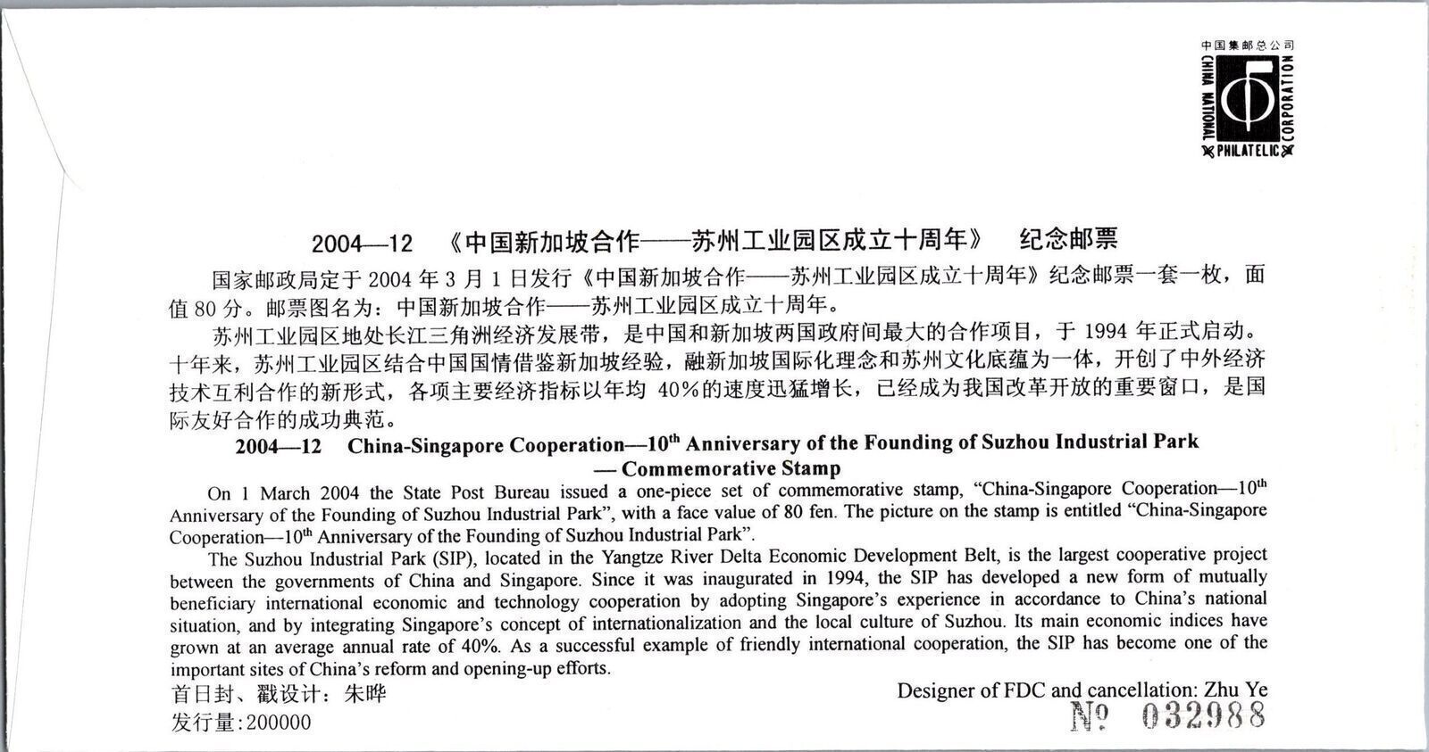 ZAYIX China PRC Mi 3518 FDC China-Singapore Cooperation Industry 101822SM12