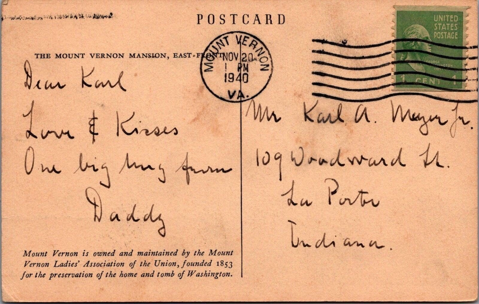 ZAYIX Postcard Mount Vernon Virginia 1938 - George Washington's Home 090222PC42