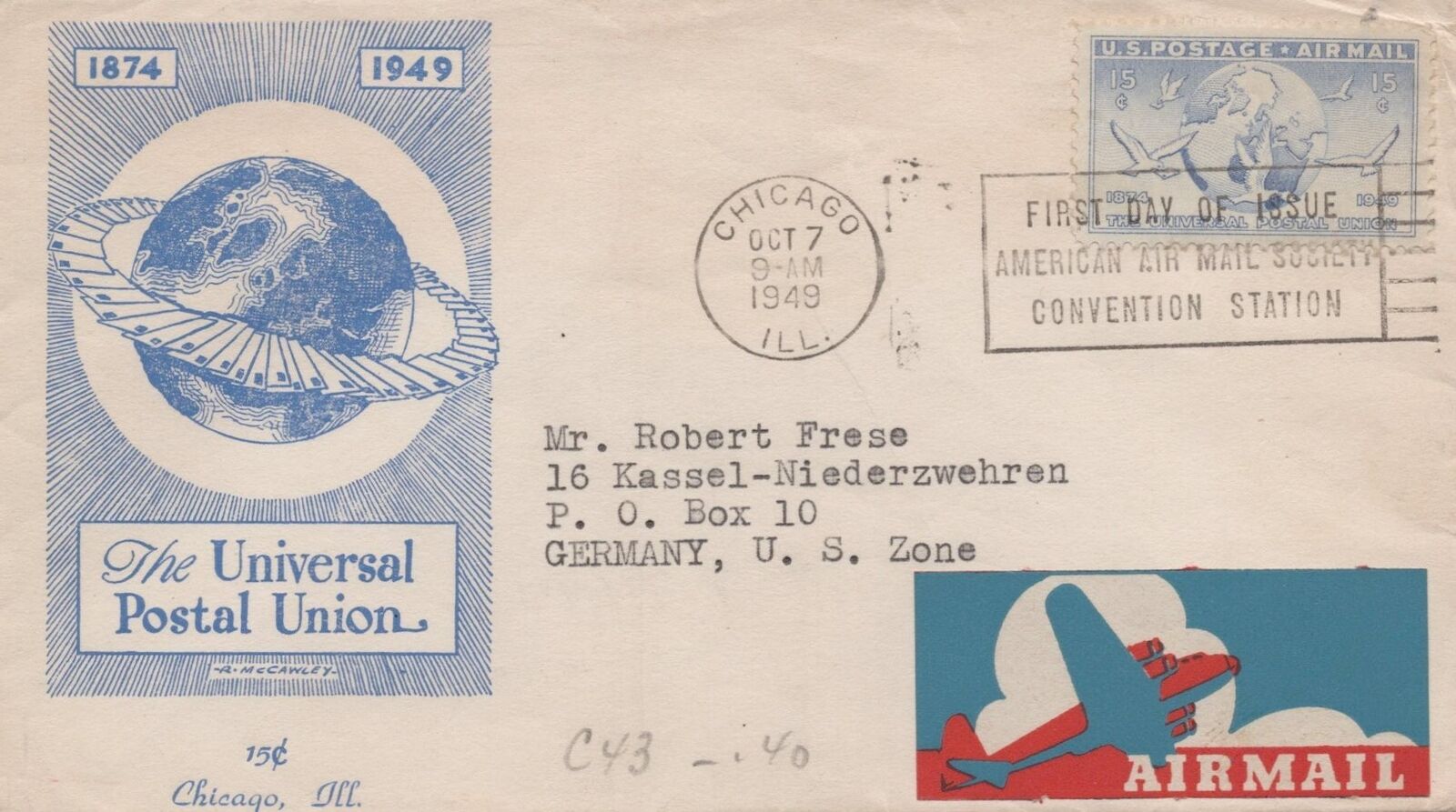ZAYIX US C43 McCawley cachet FDC to Germany UPU anniversary air USFM102023094